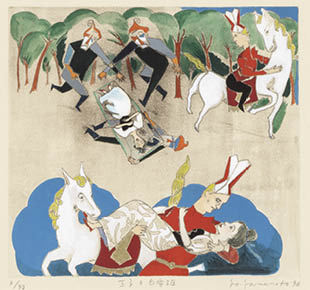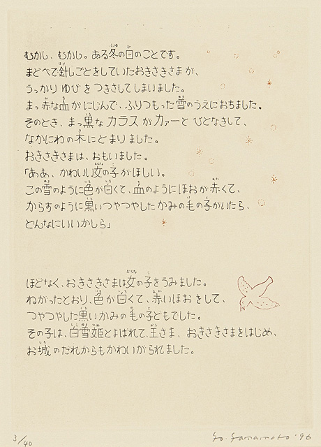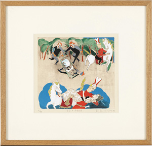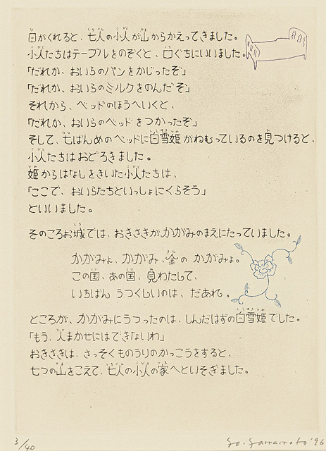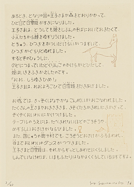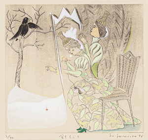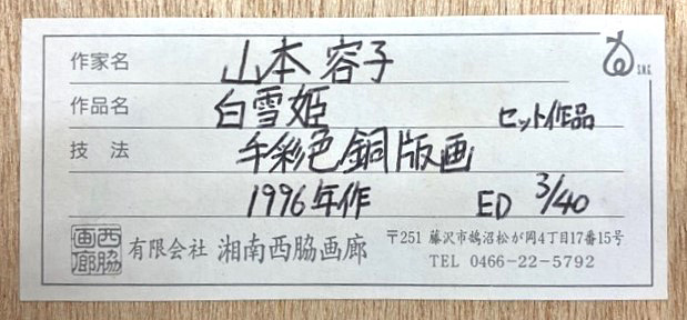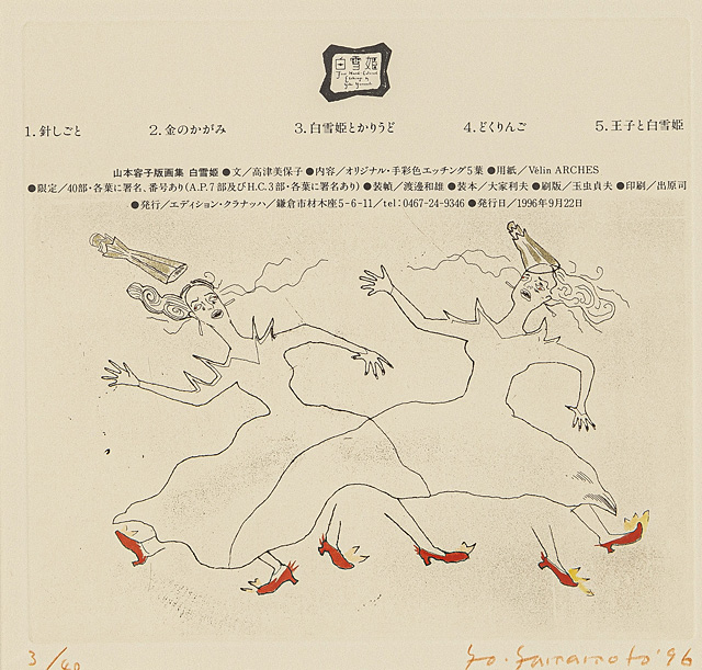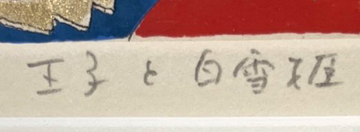 - A set of 10 prints, featuring 5 illustrations and 3 text pages from the picture book 'Snow White (World Fairy Tale Picture Book - Germany)' (ISBN 4593593190, published in Japan), along with the cover and colophon. One print, 'The Prince and Snow White,' is framed, while the remaining 9 prints come with mats suitable for framing, all of which are signed and numbered. Accompanies the picture book.