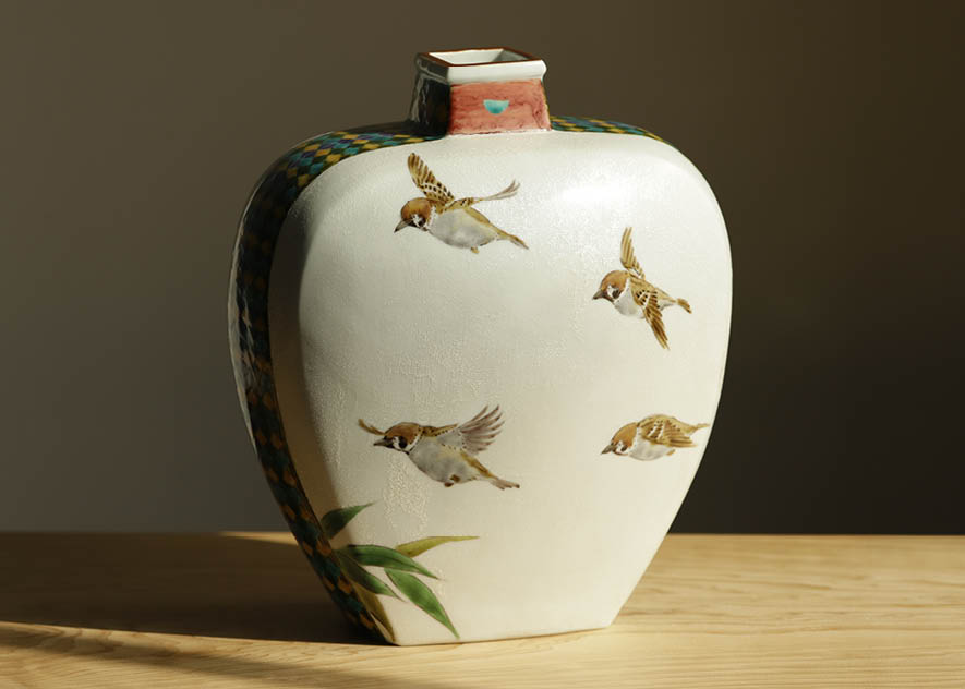 - oval jar depicting bamboo and sparrow on silver base