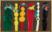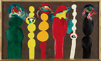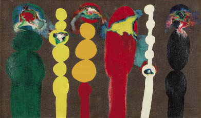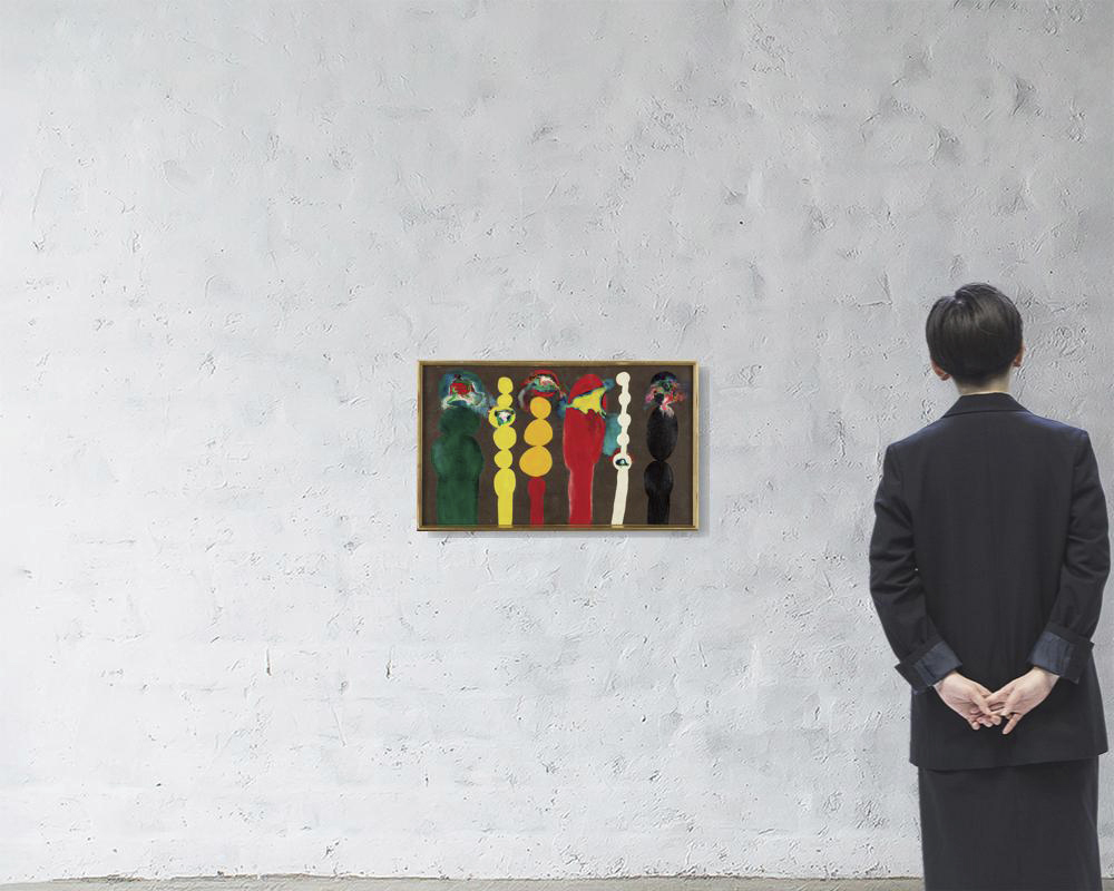 1966, oil and synthetic resin paint on gold tan leather, frame window size 38x65cm, signed and dated at lower right image, inscribed by KOMAGATA Jukichi on verso, framed.* *Not examined out of frame.