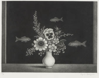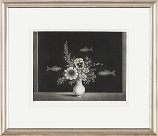 Reifushobo No.353, 1969, maniere noire, 26.4x35.4cm, sheet size 37.5x51cm, signed in the lower right margin, titled, dated and ed.80 in the lower left margin, with a sticker of 77 Gallery, with a blind stamp "KIYOSHI HASEGAWA", framed.