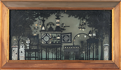 glass, cutout, lighting equipment, window size 58.8x118.3cm / H82.5xW142.5x22.5cm, signed at lower left image.