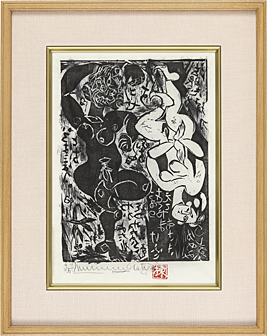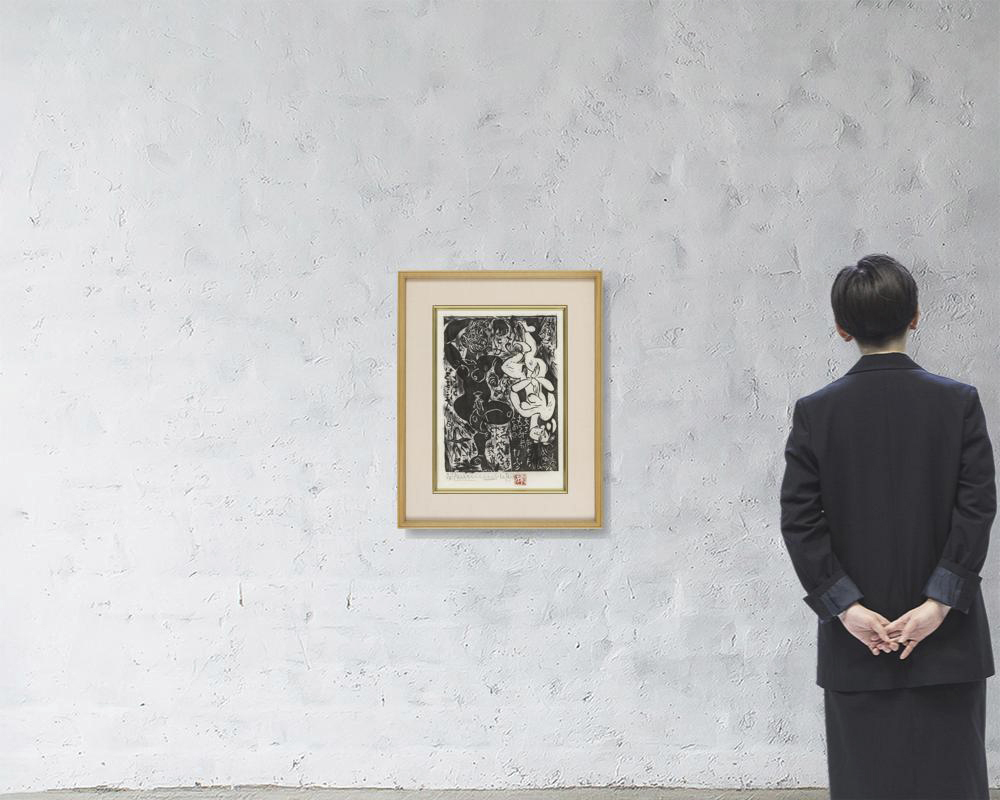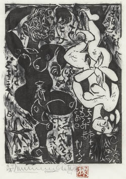 Kodansha vol. 6, No.287, 1973, woodcut, 42x30.7cm, sheet size 55x41.2cm, signed and sealed in the lower center margin, with a sticker signed and titled by the artist (titled "Song of universe: devote oneself to teach"), framed.
