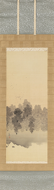 ink and color on silk, 111.8x42cm, signed and sealed at lower left image, mounted for scroll. with a registration number by Yokoyama Taikan Memorial Hall on verso, with a wooden box signed by the artist.