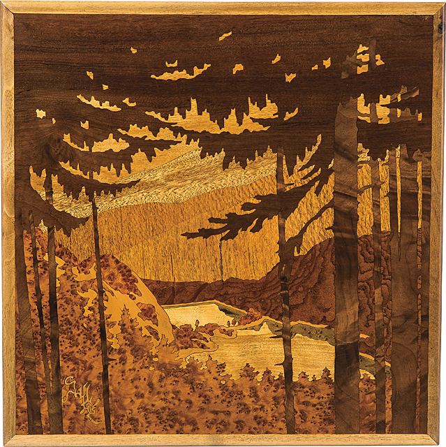 - marquetry, large/H71.3xW62.4x42.2cm, middle/H69xW50.8x40.5cm, middle/H66.5xW44.8x40.1cm, small/H64xW38.6x39.2cm, each signed within marquetry at the tabletop.