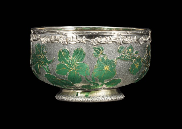 - H12.3xD22.8cm, cameo glass, acid-etched, engraving, gilt decorated, signed in gilt on the bottom, with a hallmark (Minerve) on each metal fitting.