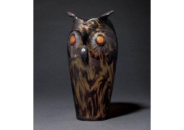 - circa 1911, H30cm, verre marmoreen, acid-etched, application, foil sandwiched in cabochon,signed (initial) and dated "1911" on the bottom,