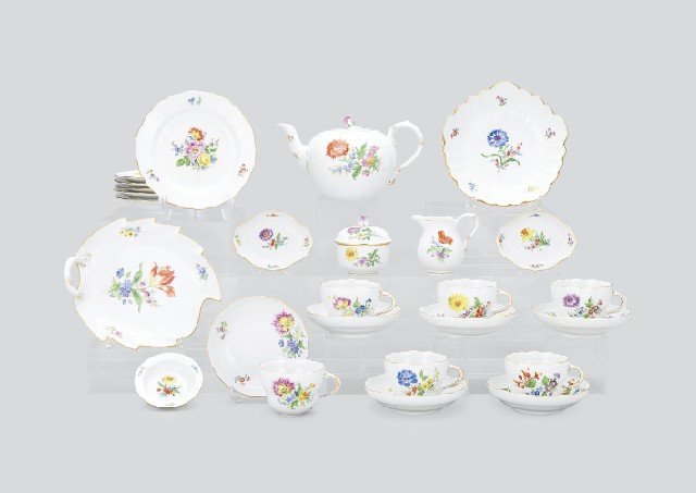 - pot/H13cm, creamer/H9.3cm, sugar pot/H9cm, 6 cups/D9cm, 6 saucers/D14.2cm, 6 plates/D18.4cm, plate/W21.7x19.4cm, 2 oval small plates/W12.5x9.7cm, bowl/H6xD19.8cm, ashtray/D9.6cm, each marked on the bottom.
