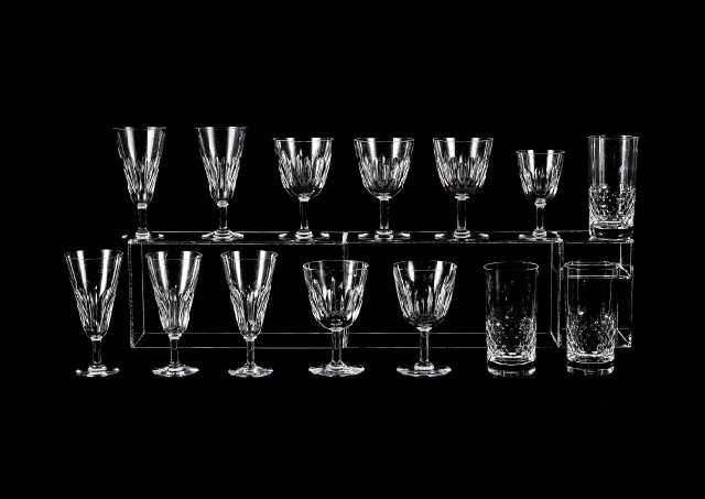 - 11 various wine glasses/H12-15.5cm, 3 tumblers/H14cm, each with a stamp on the bottom.