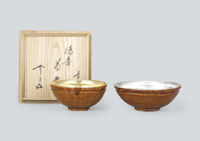 - gold/H7.1xW15cm, silver/H6.7xW18cm, each marked at the side of the foot-ring, with tomobako(the box signed by the artist), with kakitsuke by HOUNSAI.