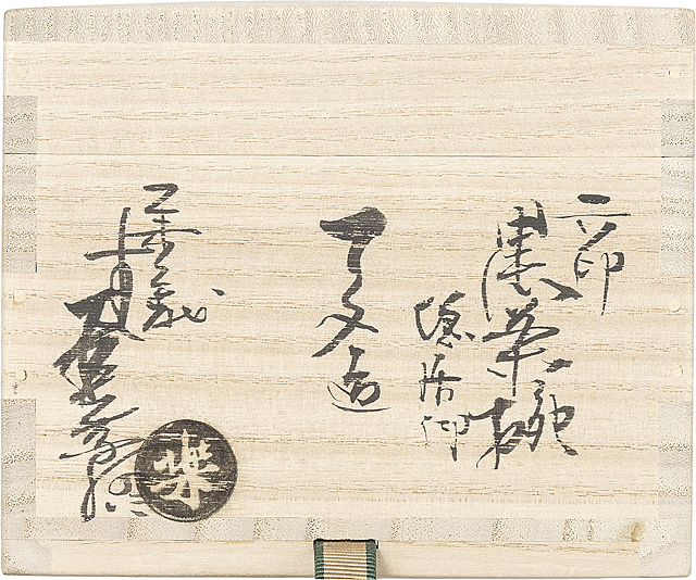 - H7.7xW11.3cm, marked inside and inside the foot-ring, with tomobako(the box signed by the artist), with a box with kakitsuke by RAKU Jikinyu XV, with kakitsuke by HOUNSAI Genshitsu.