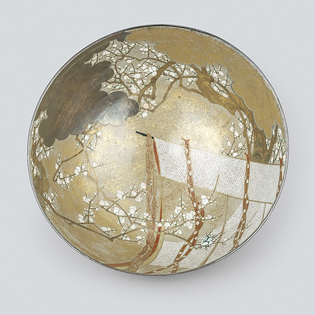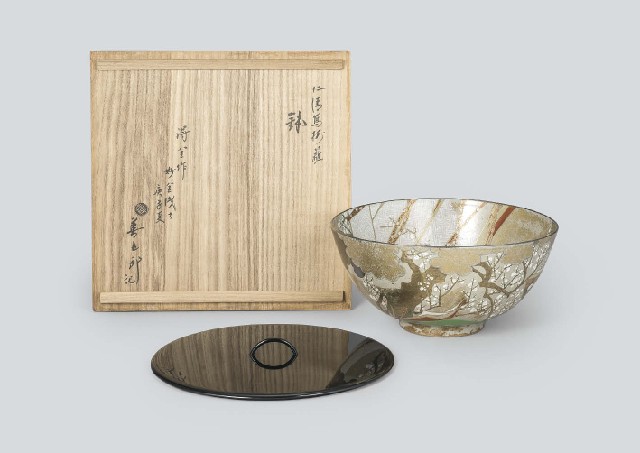 - H13.5xW28.2cm, marked inside the foot-ring, with a box with kakitsuke by EIRAKU Myozen, with a box with kakitsuke by EIRAKU Sokuzen XVI, with a lacquered lid.