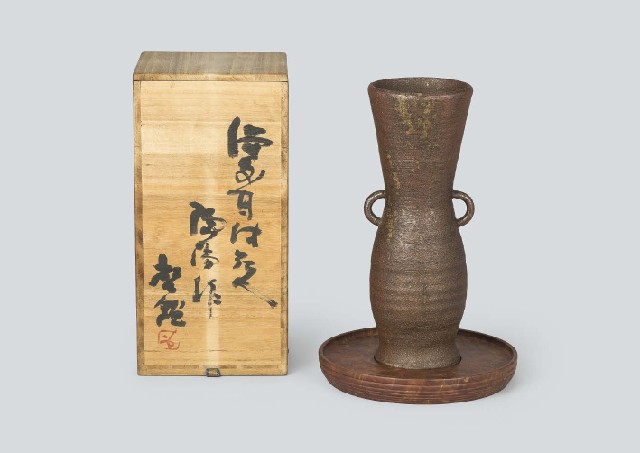 - H27.8xW10.2cm, marked underneath, with a box with kakitsuke by FUJIWARA Kei, with a wooden pedestal(marked underneath).