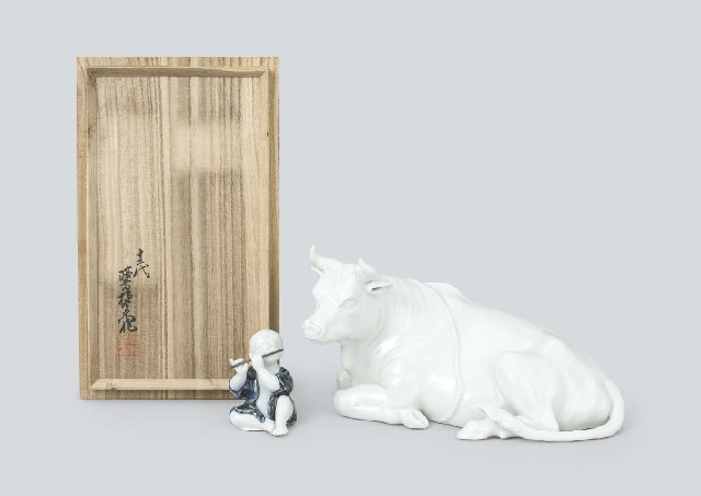 - child/H6.9xW5.2x7.2cm, cattle/H13.4xW25x13.6cm, marked underneath, with tomobako(the box signed by the artist).