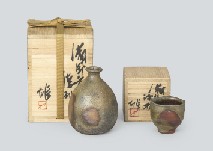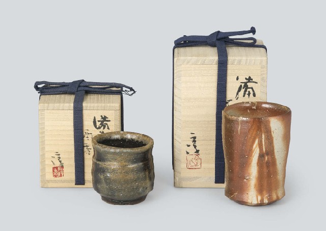 - "Bizen sake cup"/H6.6xW6.9cm, marked at the side of the foot-ring, "Bizen beer mug"/H9.8xW7.2cm, marked underneath, each with tomobako(the box signed by the artist).