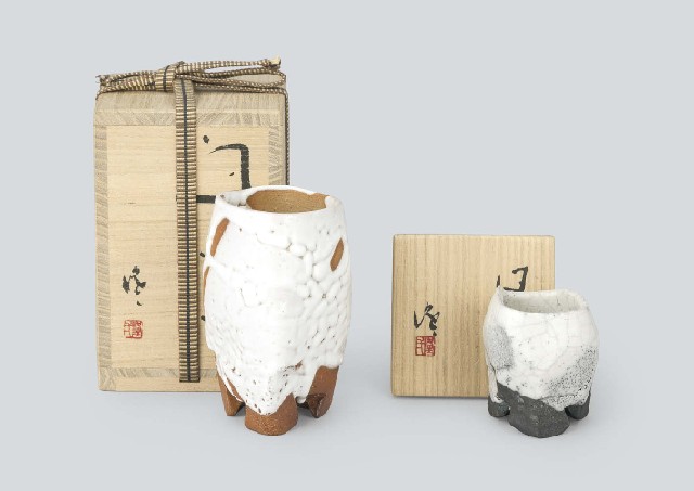 - "White tripod tea cup"/H11.5xW6.9x7cm, "White sake cup"/H7xW6.2x6.1cm, each marked on the side, each with tomobako(the box signed by the artist).