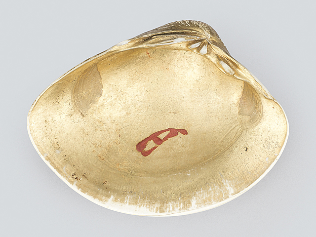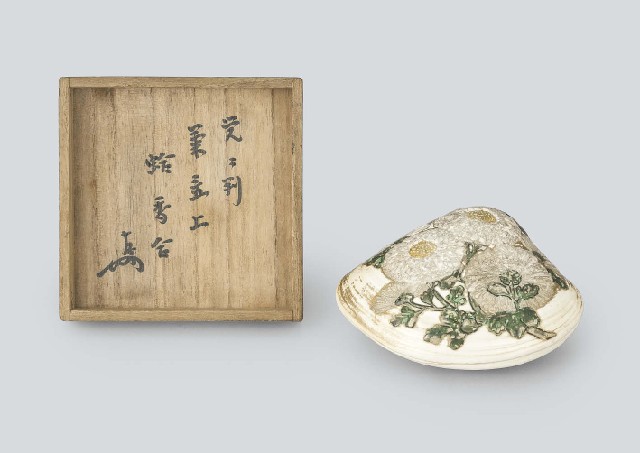 - KAKUKAKUSAI marked clam incense container with design of chrysanthemum