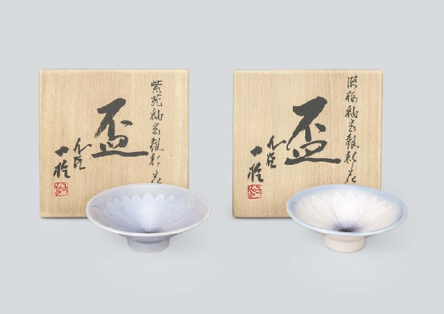- "Purple sake cup with design of flower in underglaze silver"/H3.4xW10.7cm, "Pale pink sake cup with design of flower in underglaze silver"/H3.4xW10.4cm, each marked inside the foot-ring, each with tomobako(the box signed by the artist).