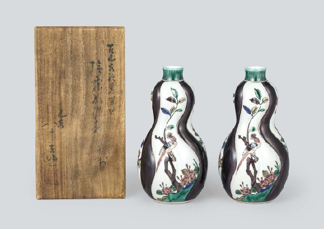 - Ko-kutani styled gourd shaped sake decanter on purple ground (a set of 2)