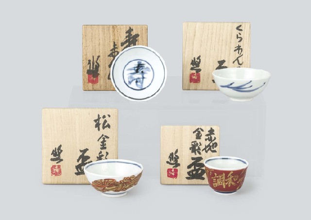 - "Sake cup with design of pine tree in overglaze enamel and gold"/H3.3xW7.4cm, "Sake cup with design of character in overglaze enamel"/H3.5xW7.2cm, "Red sake cup in overglaze enamel and gold"/H4xW5.5cm, "Blue and white porcelain sake cup"/H3.3xW7.4cm, each marked inside the foot-ring, each with tomobako(the box signed by the artist).