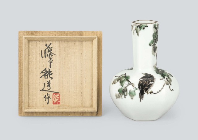 - Faceted vase with design of bird in white glaze and overglaze enamel