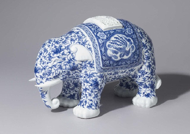- Blue and white porcelain elephant ornament with bajixiang design