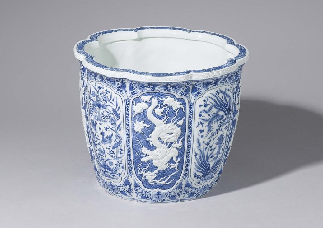 - Blue and white porcelain large decorative bowl with design of dragon, phoenix and water fowl