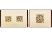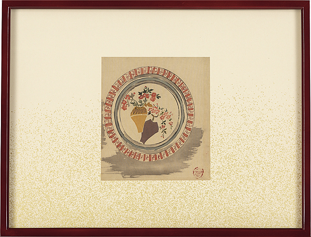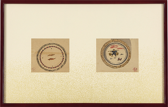 - 3 paintings of color on cloth are mounted on 2 frames, LEFT/"Painting of plate with design of fish":17.6x19.2cm, "Painting of plate with design of figure":17x21.3cm, RIGHT/"Painting of plate with design of flower basket":22x19.4cm, each sealed, with a box, with a signed board by FUJIWARA Kei, each with a seal signed by KURODA Totoan, each framed.* *Not examined out of frame.