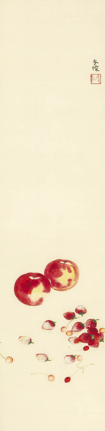 ink and color on silk, 111.5x27.6cm, signed and sealed, mounted for scroll, with a wooden box signed by ONO Chikkyo.