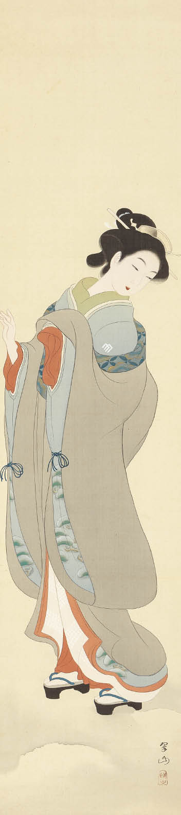 ink and color on silk, 121x27.4cm, signed and sealed, mounted for scroll, with a wooden box signed by the artist.