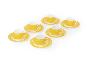 1998, ceramic, 6 cups/each size H5.5xW10.7x8cm, 6 saucers/each size D14.2cm, 6 plates/each size D19.2cm, all with a printed signature and ed.500 underneath, each with an original case.