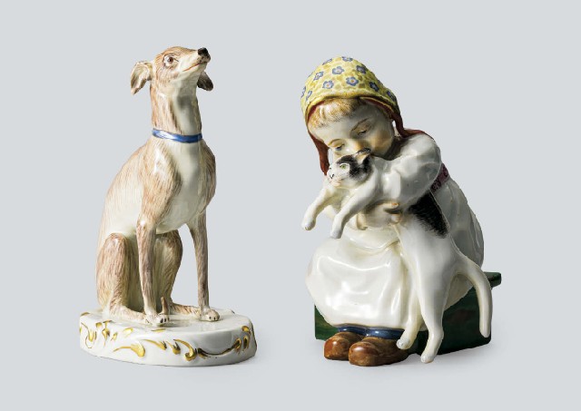 - dog/H12.8cm, model no.78741, Girl with cat/H12.3cm, model no.73367, modelled by Hentschel, each marked on the bottom.
