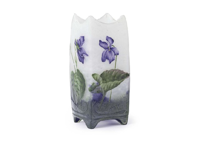 - H13.1cm, verre marmoreen, acid-etched, enamelled, gilt decorated, signed in gilt on the bottom.