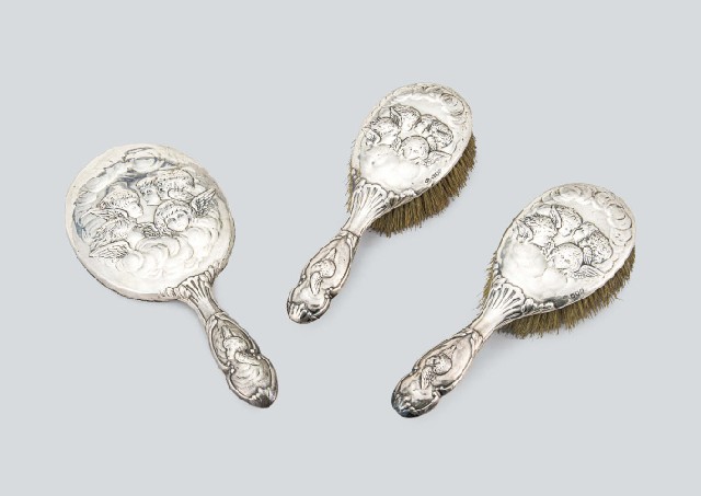 - mirror/L28.5cm, 2 brush/L25cm, each stamped with a hallmark (London 1902, 1910), approx.740g (gross weight).