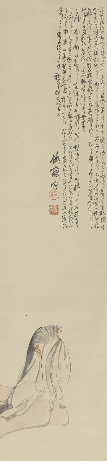 ink and color on paper, 128.8x30.7cm, signed and sealed, mounted for scroll, with a wooden box signed by SAKAMOTO Kojo.