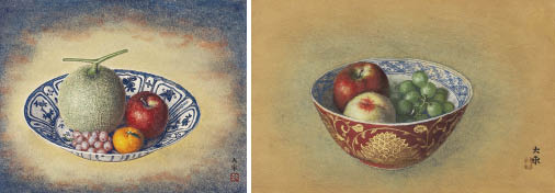 this lot accompanies another work; 【Fruit in a kinrande bowl】(8 Japanese painting type size (H45.5cm), with a sticker signed and titled by the artist, following details: identical to main item), both are framed.