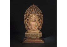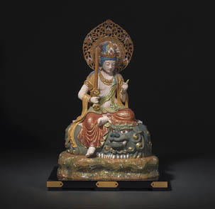 color on wood carving, H46xW32.5x24.8cm (including pedestal), incised with signature on the back, with a wooden box signed by the artist, with a wooden plate, with a glass case.