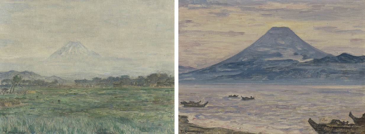 Condition : lined to canvas (verso is not examined); 【Mt. Fuji from Sagami harbor】: some foxing at the image, some pigment loss to the edges, 2 pinholes at the corners.