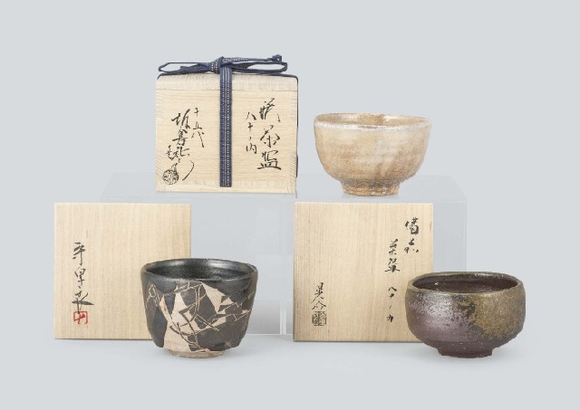 - WADA Morihiro "Tea bowl with design of bird"/H9.1xW12.2cm, marked inside the foot-ring, SAKAKURA Shinbei XV "Hagi tea bowl"/H8.2xW13.3cm, marked at the side of the foot-ring, KANESHIGE Kosuke "Bizen tea bowl"/H7.8xW12.5cm, marked at the side of the foot-ring, each with tomobako(the box signed by the artist).