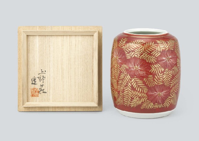 - Red vase with design of silk tree in overglaze enamel and gold