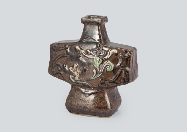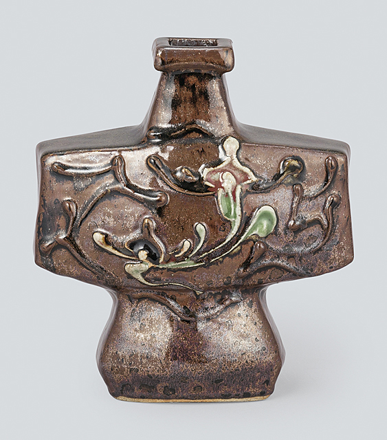 - Flask with design of flower in Tsutsugaki in iron glaze