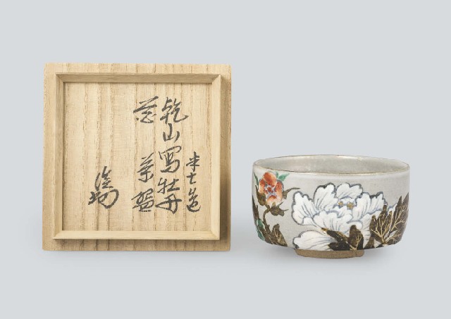 - Kenzan styled tea bowl with design of peony