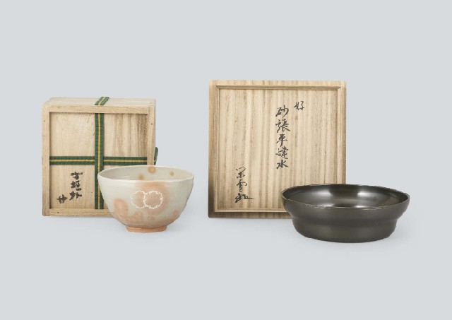 - SUGIMTO Sadamitsu "Tea bowl"/H8.1xW13.5cm, JOYA "Sahari (copper alloy) flat kensui (waste-water jar)"/H5.5xW17.8cm, with konomi kakitsuke by KAWAKAMI Kansetsu, each with tomobako(the box signed by the artist).