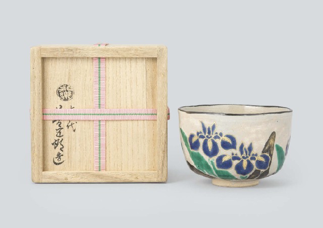 - Kenzan styled tea bowl with design of iris