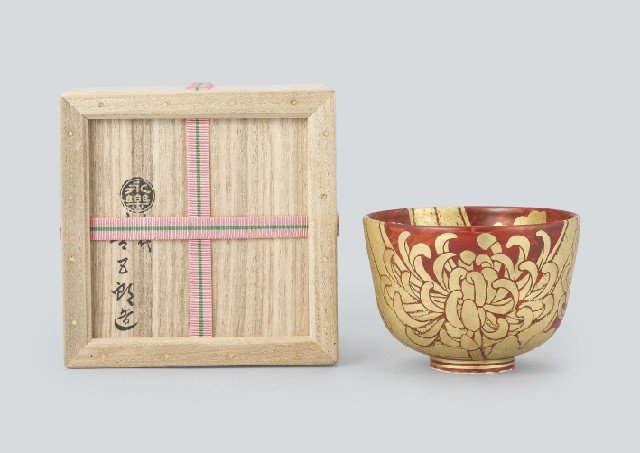 - Red tea bowl with design of chrysanthemum in gold paintings
