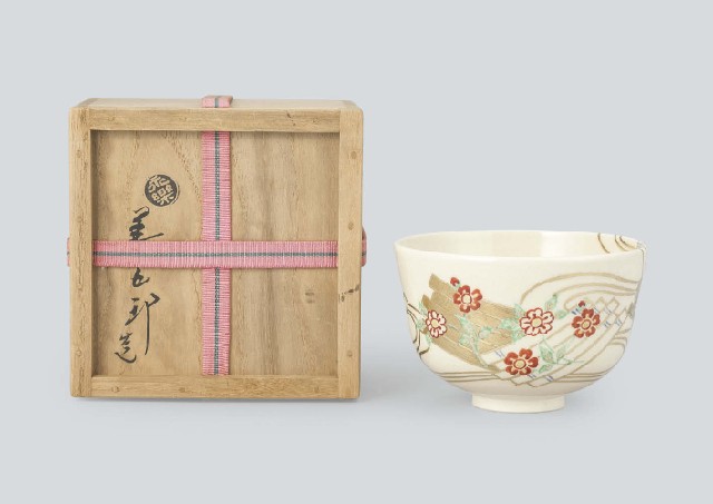- Ninsei styled tea bowl with design of flower and raft