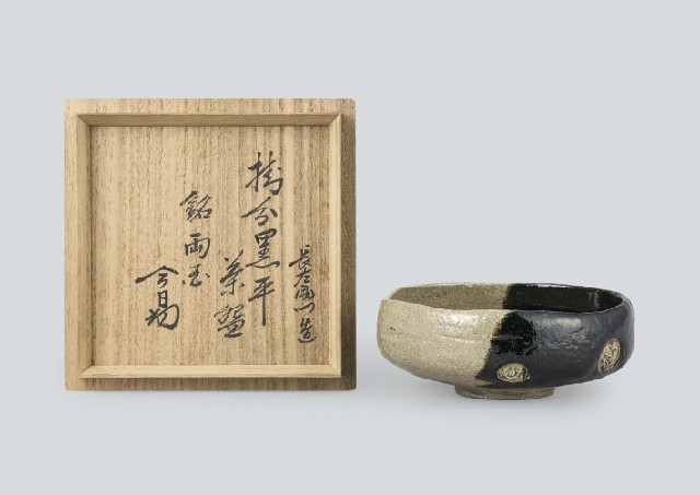 - Black flat tea bowl in kakewake