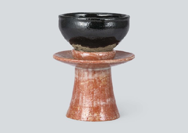 - Black tenmoku tea bowl with tenmoku stand