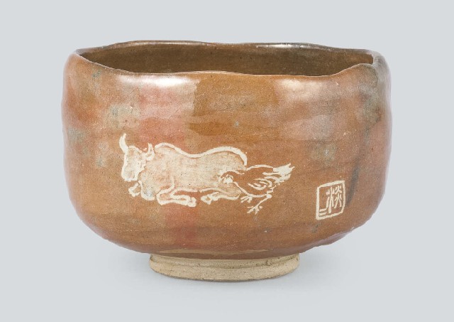 [Lot0243] Red tea bowl with design of cattle and rooster
