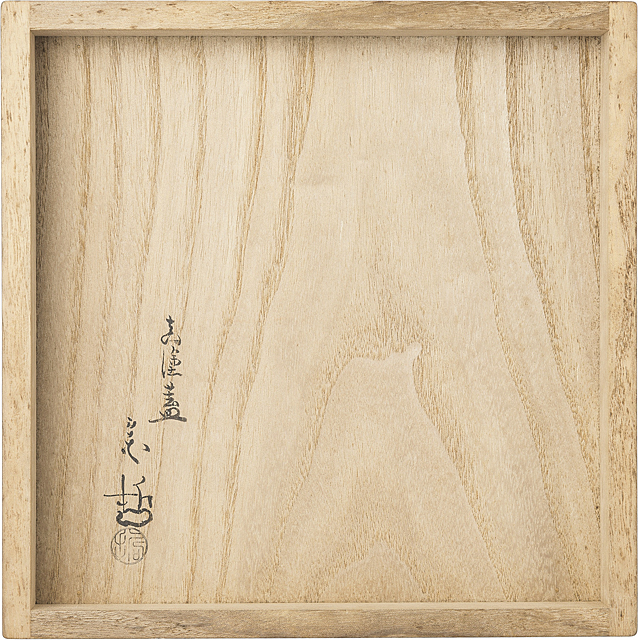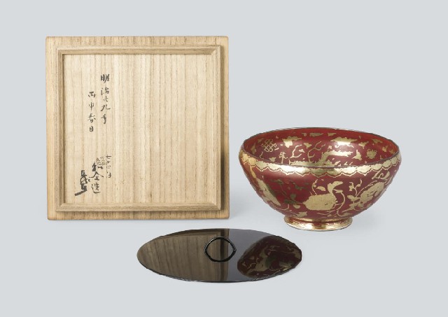 - 1896, H11.8xW24.4cm, marked inside the foot-ring, with tomobako(the box signed by the artist), with a lacquered lid(lacquered lid by NAKAMURA Sotetsu XI, marked on the back, signed and stamped at the middleboard of the box).