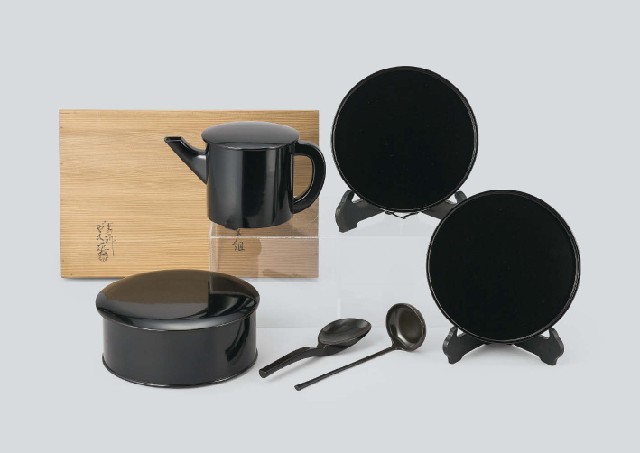 - rice container/H10.1xW23.8cm, ladle/L23.3cm, pitcher/H15xW24.7cm, ladle for neriyu/L23.8cm, round tray (a set of 2)/each size W22.7cm, with tomobako(the box signed by the artist).